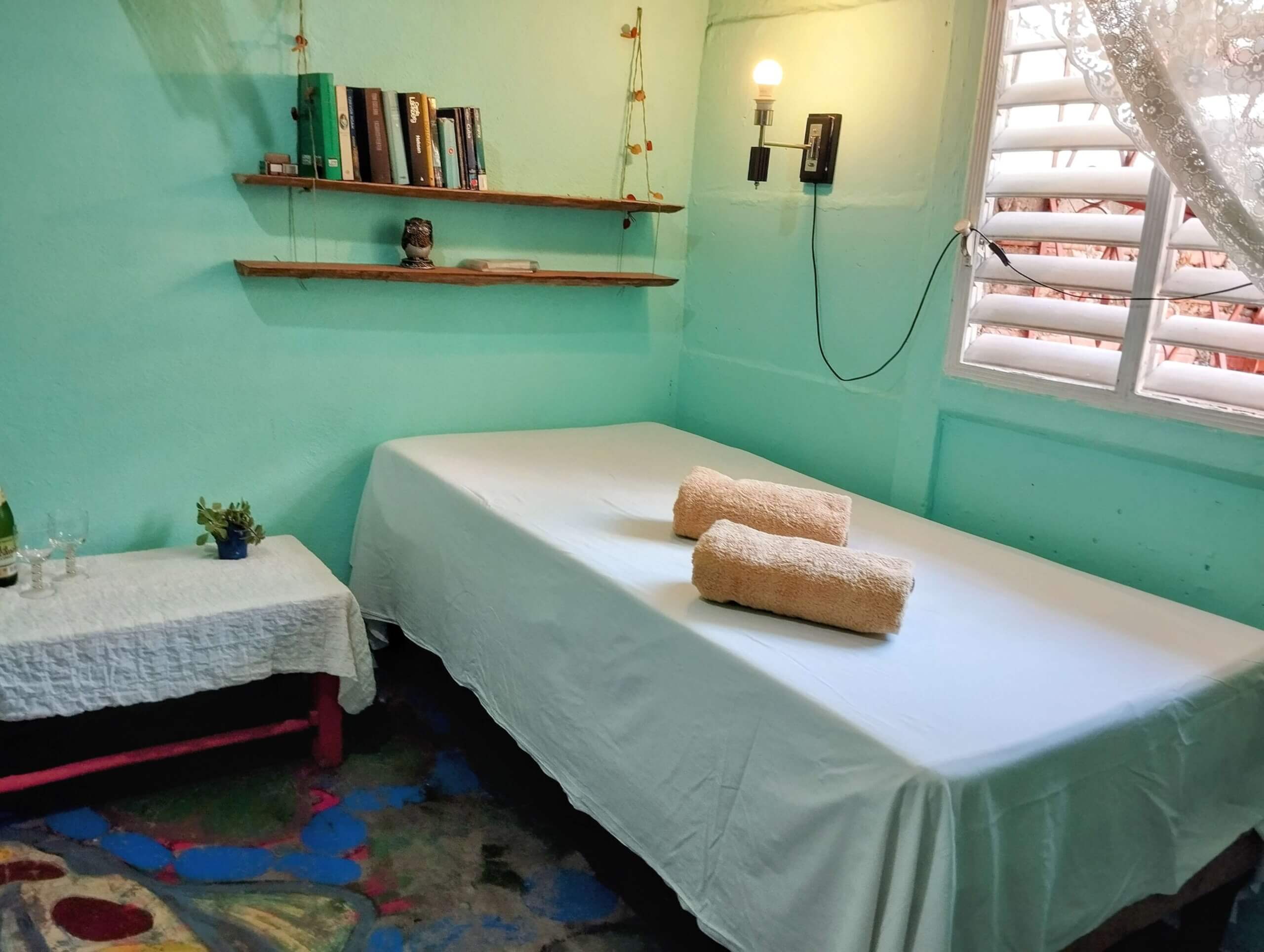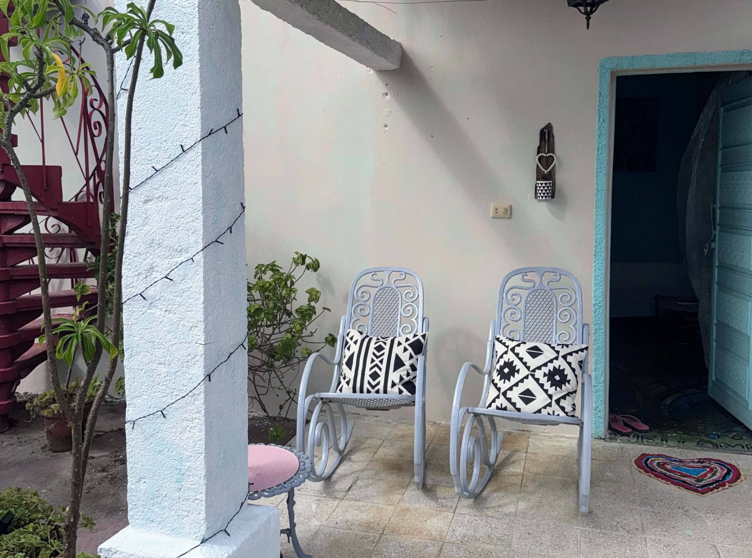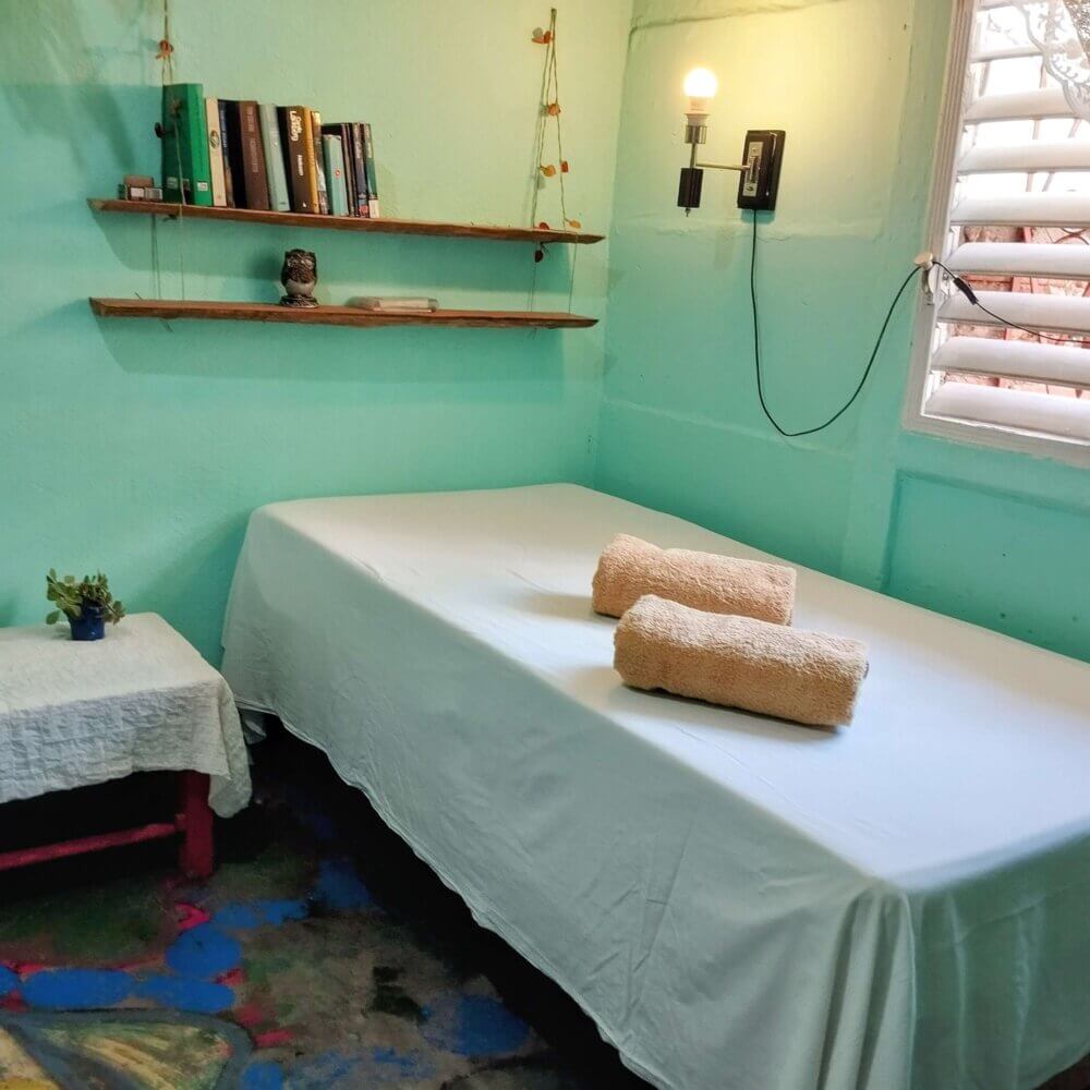 Rommet har direkte tilgang til stuen og vår koselige bakgård hvor du finner bananplanter og avocado-trær. Her arrangerer vi middager og frokoster, lærer bort salsa eller spiller domino.