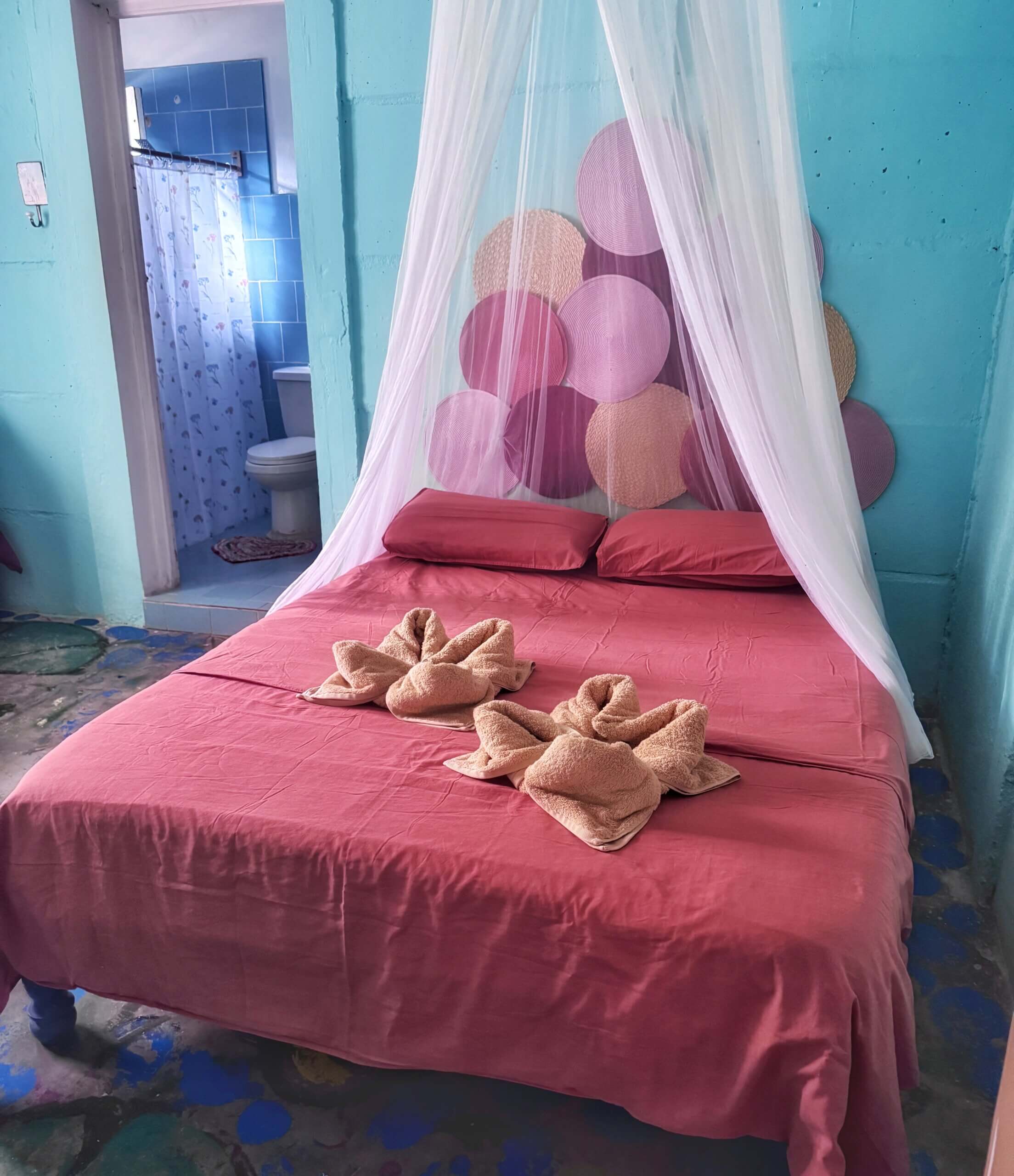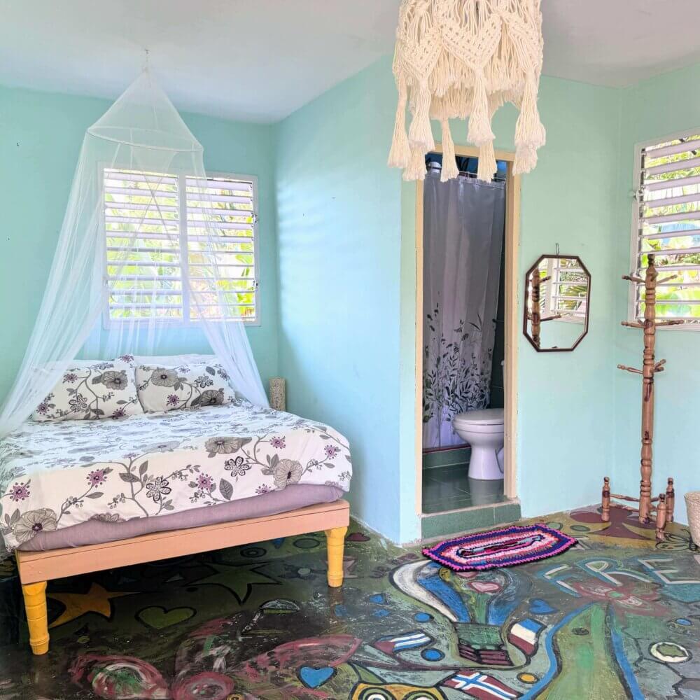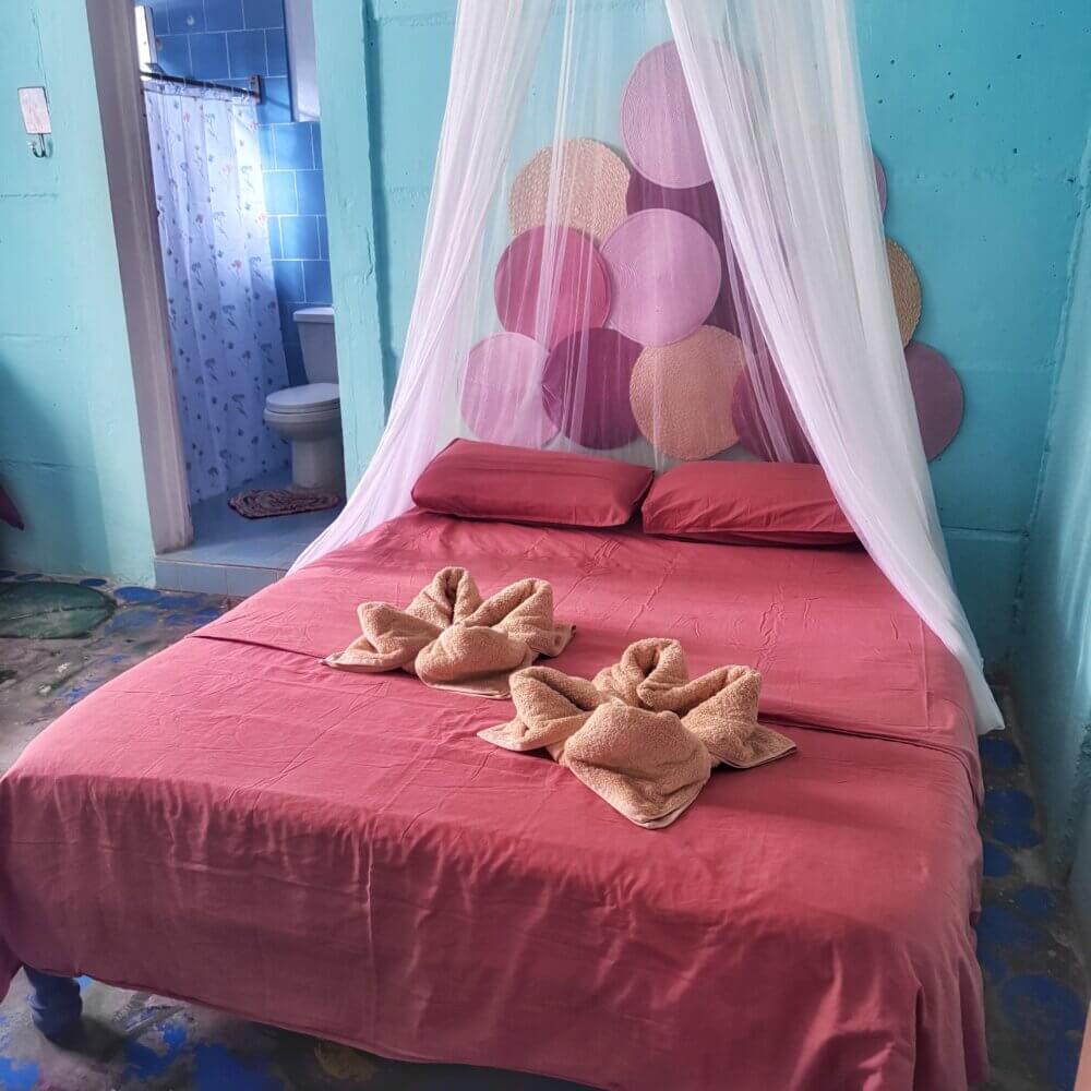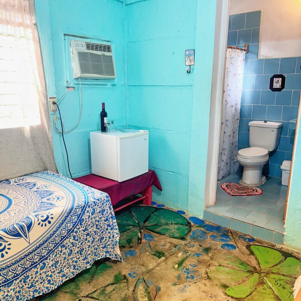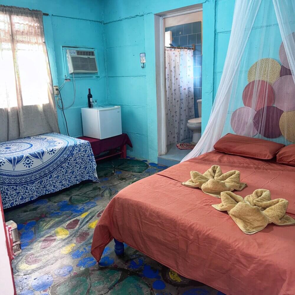 Rommet El Colibri er stort og luftig og har egen inngang fra gateplan. Rommet inneholder en dobbeltseng og en enkeltseng. Men det er også mulig å sette inn en ekstra enkeltseng ved behov. Værelset har flere vinduer, håndmalte gulv og turkise vegger. Her har du eget bad, aircondition, vifte og et lite kjøleskap.