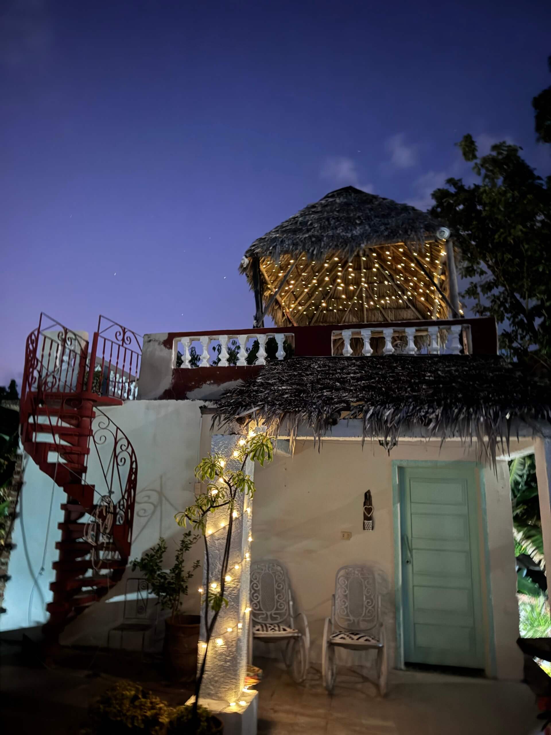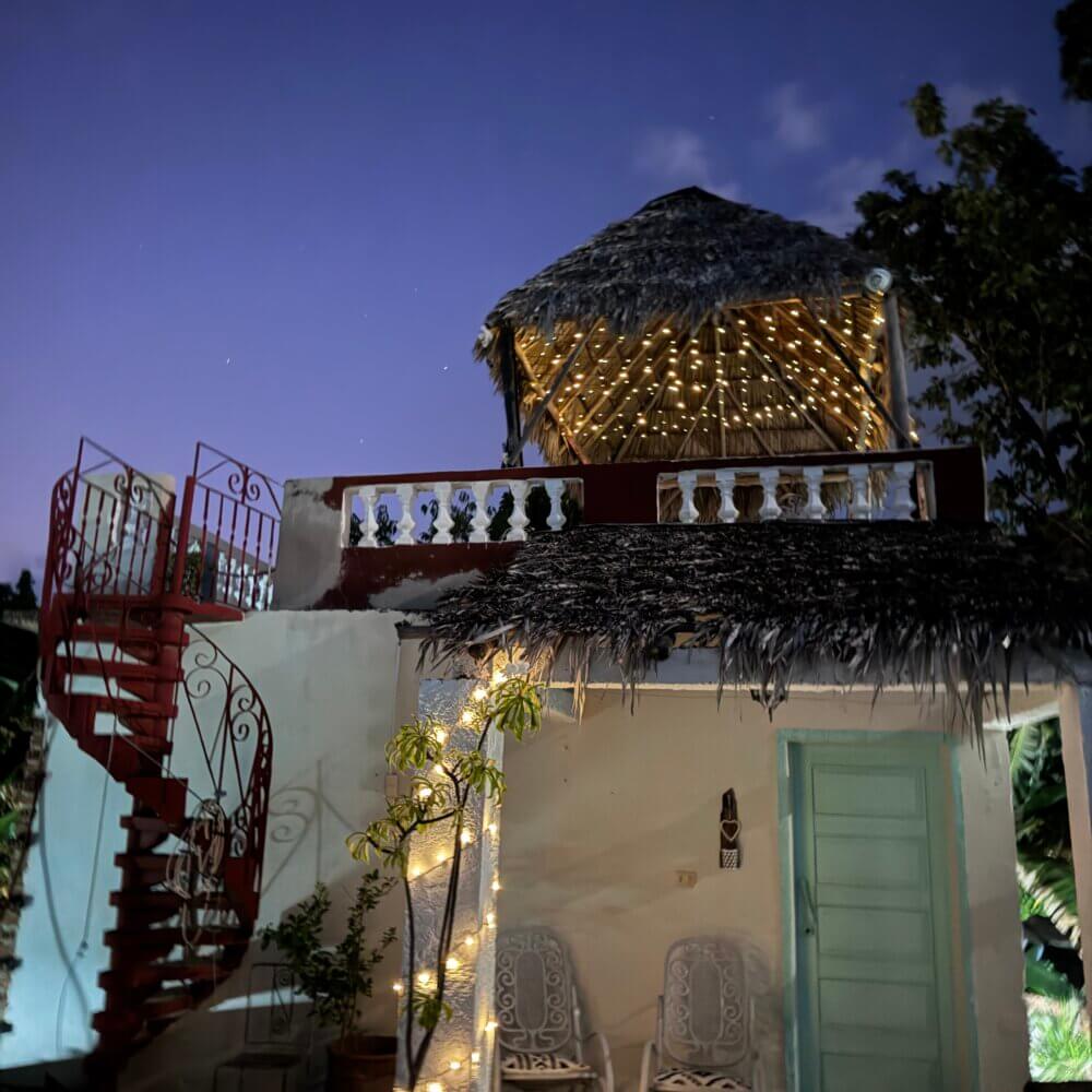 Utenfor har du en terrasse med gyngestoler for deg selv. Perfekt for å slappe av etter lange dager i solen i Trinidad. Går du en trapp opp kommer du til takterrassen med utsikt til det karibiske hav. Er du heldig kan du spotte en colibri eller to som nyter kvelden sammen med deg.